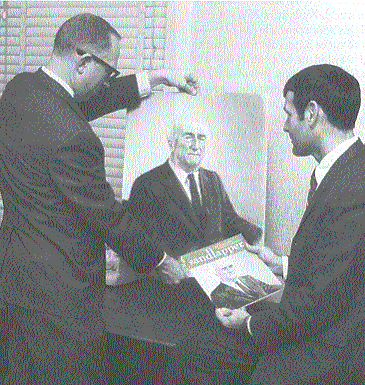 Photo by Larry Cribb: Sandlapper® magazine founder and editor Bob Wilkins, left, and Del Roberts, later editor, examine 1950 scholar Rachel Oldham’s portrait of Byrnes in 1970. The portrait was used on the magazine’s first-ever cover.